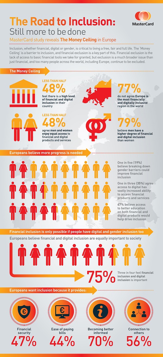 Commenting on the findings, Ann Cairns, President International Markets for MasterCard, said: “Financial, digital and gender inclusion are intrinsically linked. Going hand in hand, these elements are critical to living a free, fair and full life, and Europeans agree. However, despite being one of the most developed regions in the world, it is clear more needs to be done to close the gaps in inclusion, with Europeans believing significant numbers in society are still excluded. In effect, a ‘money ceiling’ exists, acting as a barrier to inclusion and impeding universal access.”