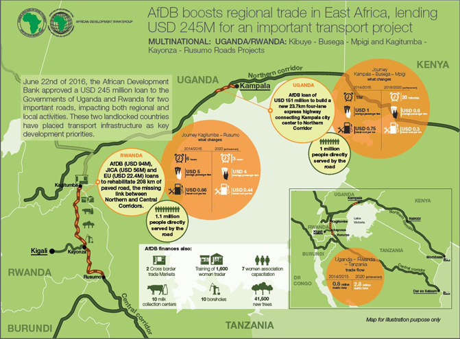 On Wednesday, June 22, 2016, the African Development Bank approved USD 245 million in loans and grants to the Governments of Uganda and Rwanda to finance a transport project that will boost regional trade and decongest traffic from Kampala (Busega) city to Mpigi. Uganda and Rwanda are landlocked countries and transport infrastructure is a key factor to stimulate socio-economic activities and improve competitiveness.