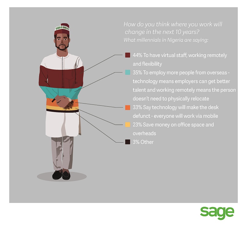Looking to the future, in the next ten years, 33% of Nigerians surveyed believe that technology will make the concept of ‘your desk’ defunct and that, in future, everyone will work remotely and flexibly, via a mobile device. Additionally, 45% agreed the workplace will have more virtual staff, working remotely and flexibly, while 23% said that they will save money on office space and overheads.
