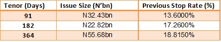 Investors Bite, UpdatesNigerian Treasury Bill Auction Notice Posted by InvestAdvocate on May 15, 2017 More in Investors Bite: NGXASI Dips -0.69% on Losses in Blue Chips March 18, 2026 Equities Close Lower Amid Sharp Increase in Volume March 18, 2026 NGX Extends Rally, Surpasses ₦130 Trillion Market Cap on Strong Trade Activity March 17, 2026May 15, 2017/Cowry AssetPlease be informed that the Central Bank of Nigeria would be issuing 91days, 182days and 364days notes at the NTB primary auction scheduled to hold on Wednesday, May 17, 2017.Share this:Click to share on Facebook (Opens in new window)Click to share on Twitter (Opens in new window)Click to email a link to a friend (Opens in new window)Click to print (Opens in new window)