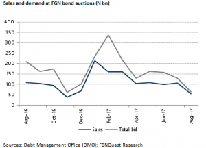 The DMO’s review will likely also dwell on its position of relative strength, given its front-loading of issuance. It has now raised N1.02trn in eight months towards the target of N1.25trn for domestic financing of the 2017 budget deficit. The FGN bonds are the principal element in the financing although the DMO can look to the retail savings bonds and the planned sukuk for modest contributions.