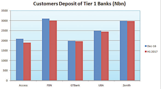 The top five banks in the country recorded N363 billion decline in customers’ deposit in the first half of 2017, H1’17, reflecting their inability to meet up with demand for higher interest rate by customers.