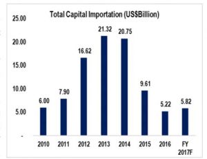 The capital importation figure in Q2, 2017 represents a growth of 97.34% over the figure reported in Q1, 2017 and a growth of 71.98% over the US$1.04bn recorded in Q2, 2016. Cumulatively, a total of US$2.70bn capital was imported into the country in the first half of 2017 (HY1, 2017), representing a growth of 54% over the US$1.75bn imported in the corresponding period of 2016. Looking at the developments in the HY1, 2017 and based on historical trend, our forecast shows that capital importation for the full year 2017 (FY 2017) should increase to US$5.82bn, representing a growth of 11.35% over the capital of US$5.22bn imported into the country in 2016.