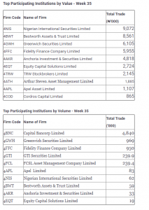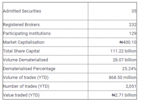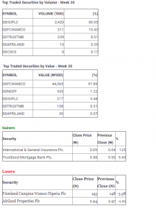 NASD OTC Securities Exchange currently trades Equity and Bonds. Of the 35 securities admitted to trade on the OTC Market, Industrial & General Insurance PLC (IGI) and FrieslandCampina WAMCO Nigeria Plc. led the market by volume and value respectively.