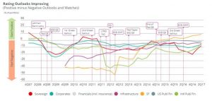 The average net outlook balance across all sectors globally improved to -3.7% by 30 June 2017 from -7.7% at 31 December 2016. However, net rating outlooks remain in negative territory for all sectors except structured finance.