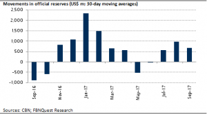 The pick-up in oil production has been an obvious positive for accumulation. Officials are encouraging the view that it is back at, or close to the 2.0 mbpd level. Further, the FGN plans to raise US$2.5bn by November from additional Eurobond sales, for which the market has a healthy appetite (Good Morning Nigeria, 05 October 2017).