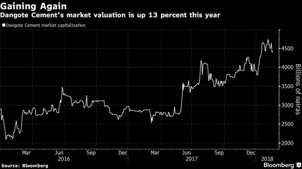 The revival of the plan comes as Dangote Cement shares climb to near records as the Nigerian economy recovers from a downturn caused by the 2014 slump in oil prices. The economy of Africa’s most populous nation went into recession in 2016 as government revenue plunged. Nigerian stocks are up 11 percent this year in dollar terms, the sixth best performance globally according to data compiled by Bloomberg.
