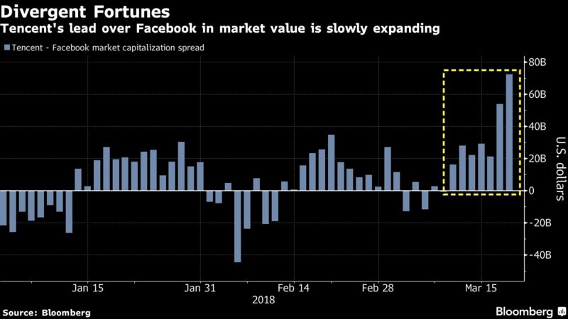 Tencent Holdings Ltd. is now about $72 billion more valuable than Facebook Inc., a rift that’s widened to its largest level ever as the California-based company deals with a string of controversies culminating in the Cambridge Analytica data crisis.