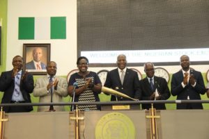L – R: Shows Bamidele Asije, Non-Executive Board Member, ABC Transport Plc; Prince Olumide Obayomi, Chairman, ABC Transport Plc; Tinuade Awe, Executive Director, Regulation, NSE; Frank Nneji (OON), MD/CEO, ABC Transport Plc; John Okoro, Independent Director, ABC Transport Plc and Godstime Iwenekhai, Head, Listing Regulation, NSE during a Closing Gong Ceremony to commemorate their 25th Anniversary at The Exchange on Tuesday
