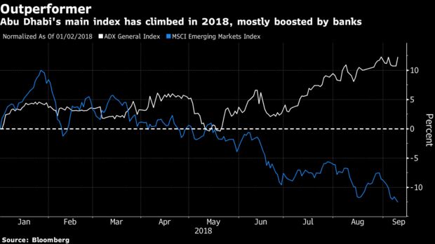 Abu Dhabi’s main stock gauge has jumped more than 13 percent this year, with banks contributing the most to the gain because of mergers and acquisitions. The performance compares to a drop of about 12 percent for the MSCI Emerging Markets Index.