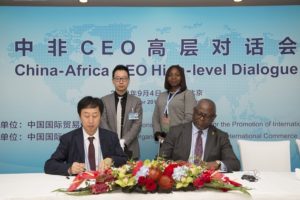 Adesola Adeduntan, MD/CEO, First Bank of Nigeria Limited (sitting right) with Hou Zhigang, Chairman & President of China-Africa E-Commerce Co.,Ltd. (sitting left), whilst Bashirat Odunewu , FirstBank’s Group Executive, International Banking Group, and Zhicheng Jiang, Director of Marketing of China-Africa E-commerce, look on during the MOU signing at the China-Africa CEO High level Dialogue in China, recently.