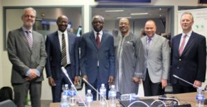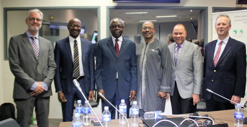 Secretary-General of the Bank Vincent Nmehielle hosted the press event held at the Bank’s headquarters in Abidjan. Senior management in attendance included Vice-president, Private Sector, Infrastructure and Industrialization, Pierre Guislain; Vice President Corporate Services and Human Resources, Mateus Magala and Gauthier Bourlard from the Bank’s Resource Mobilization and Partnership Department.