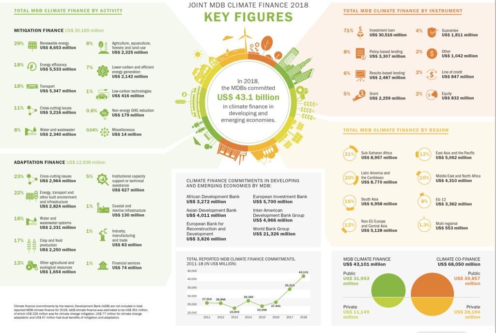 Climate financing by the world’s largest multilateral development banks (MDBs) in developing countries and emerging economies rose to an all-time high of $43.1 billion in 2018, boosting projects that help developing countries cut emissions and address climate risks.