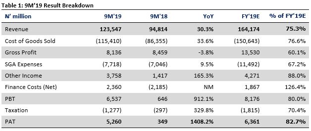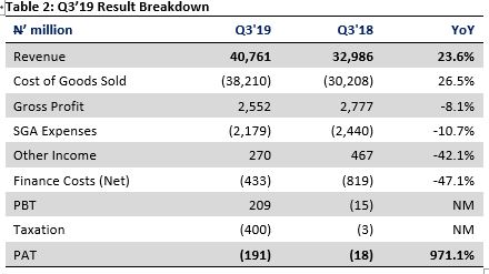 - Q3’19 gross margin declined by 2.2 ppts YoY to 6.26% in Q3’19, reflecting cost pressures in the fuels business ( cost of sales to sales ratio: 96.1% in Q3’19 vs 92.9% in Q3’18). In our view, this reflects the impact of the reported increase in PMS depot price to N117/litre from N113/litre in 2018