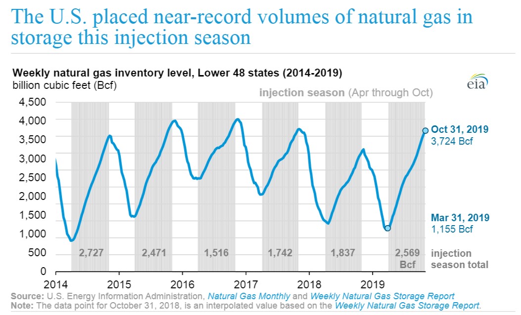 – Natural gas inventories have surged this year, rising from a low point of 1,155 billion cubic feet (Bcf) in April to 3,724 Bcf at the end of October.