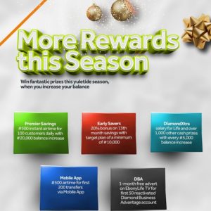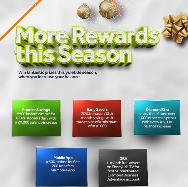 To show appreciation for their patronage, we are going to feature three different DiamondXtra draws; Senior citizens draw, Women’s draw and the National quarterly draw this December. We will reward 19 senior citizens who are 50 years old and above, 10 Women in which one of them will win a shopping allowance of N100,000 per month for one year and 9 others will win N300,000 each and of course 1,016 lucky customers will emerge winners from our quarterly draw”.