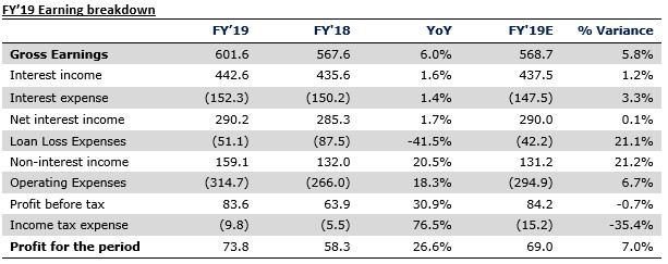 - Gross loan growth was weaker (-6.1%) at N1.9 trillion, though we note the impact of charge-offs during the period. Ex charge-offs, gross loan growth would have been 11.0% in FY’19. This is more evident in the 10.9% growth in net loans and advances to customers, the first expansion in 3 years.