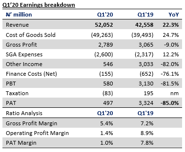 - ARDOVA grew turnover by 22.3% YoY to N52.1 billion in Q1’20, mainly supported by a 24.6% increase in Fuel revenue to N47.8 billion and a marginal increase in lubricant sales. Revenue growth was driven by improved product supply and greater market penetration for white products. Notably, revenue rose across PMS (+34.0% YoY), ATK (+276.0% YoY), and Lubricants (+0.1% YoY) sub-segments in Q1’20