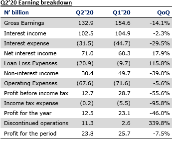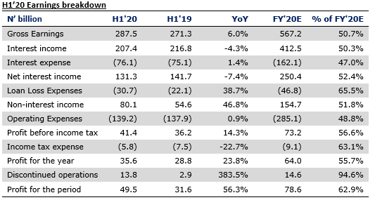 - H1’20 earnings surged by 56.3% YoY, supported by a 46.8% jump in non-interest income and a N13.8 billion gain in discontinued operations that was mostly influenced by the sale of the firm’s 65.0% stake in FBN Insurance Ltd