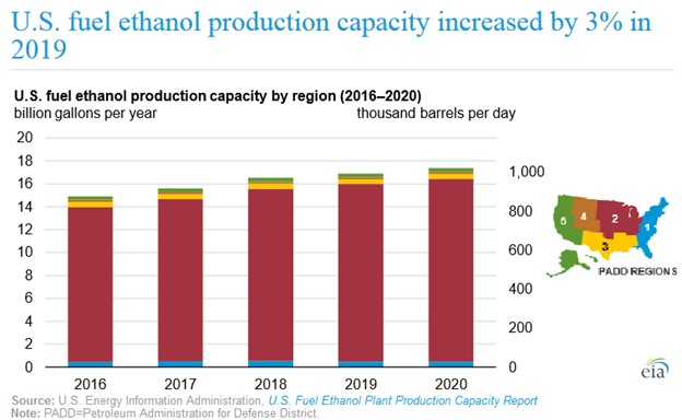 – Fuel ethanol production capacity in the U.S. hit 17.3 billion gallons per year (gal/y), or 1.1 million barrels per day (b/d), as of January 2020. Capacity was up 3 percent year-on-year in January.
