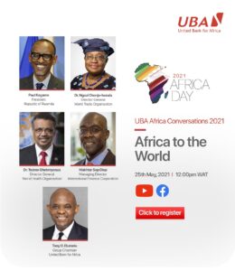 The United Bank for Africa (UBA) Plc, is set to celebrate this year’s Africa Day in commemoration of African unity with the third edition of its annual UBA Africa Conversations, headlined by Africa’s international leaders that include the President of Rwanda, H.E Mr Paul Kagame; Mrs Ngozi Okonjo-Iweala, Director-General of the World Trade Organisation(WTO); Dr Tedros Adhanom Ghebreyesus, Director-General of the World Health Organisation(WHO) and Mr. Makhtar Sop Diop, Managing Director, International Finance Corporation(IFC). The conversations will be held online on africaday.ubagroup.com