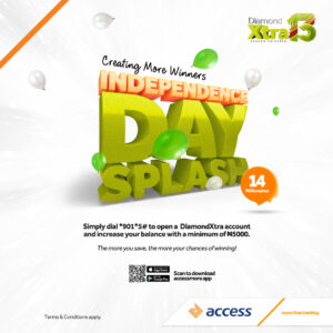 The DiamondXtra independence splash draw is open to new and existing customers of Access Bank. To be part of the winning train, simply fund your DiamondXtra account with a minimum of N5,000 or more and stand a chance to become a winner in the Independence Splash and Quarterly draws. New customers can dial *901*5# from their mobile phone or walk into any Access Bank branch close to them to open a DiamondXtra account’’.