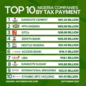 Dangote Cement paid the highest corporate income tax during the year under and was followed closely by MTN Communications Nigeria Plc which paid corporate income tax of N93.66 billion and Guaranty Trust Bank placed third with corporate income tax payment of N36.66 billion.