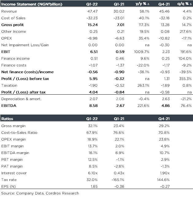 PBT was also higher at NGN5.95 billion compared to a pre-tax loss of NGN0.32 billion in Q1-21. Consequently, the company recorded a PAT of NGN4.04 billion (vs loss after tax of NGN0.84 billion).