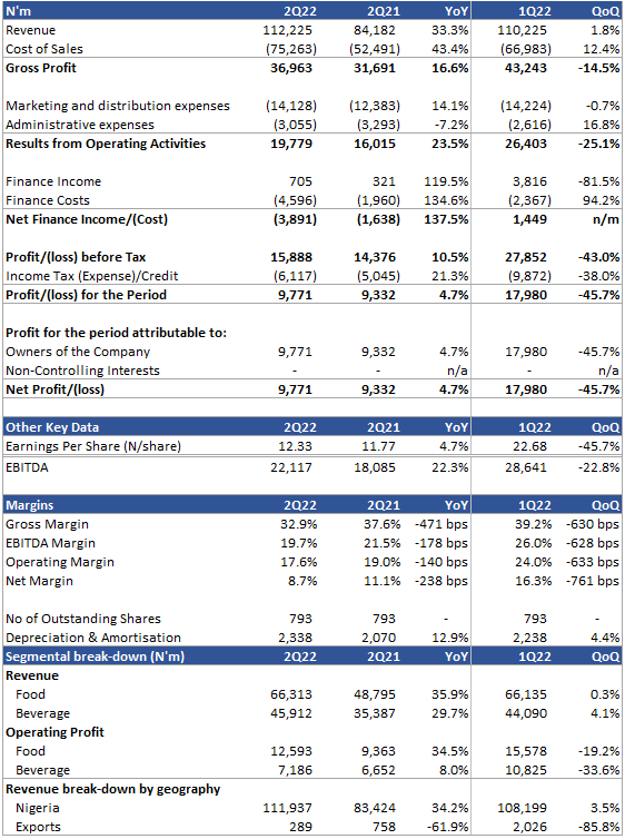 - Nestle Nigeria reported strong revenue growth of 33.3% YoY to N112.2 billion in 2Q22. A strong showing across both segments drove the performance. The revenue growth was primarily driven by a 35.9% YoY spurt in the food segment (59.1% of 2Q22 revenue) to N66.3 billion, supported by a 29.7% YoY jump in the Beverage segment (40.9% of 2Q22 revenue) that recorded N45.9 billion in 2Q22. On the geographic front, the revenue growth was driven by a 34.2% YoY increase in domestic revenue to N111.9 billion, while the exports declined by 61.9% YoY to N289 million in 2Q22. The company’s cost of sales jumped more than revenues at 43.4% YoY to N75.3 billion in 2Q22 from N52.5 billion in 2Q21, resulting in a 471 bps gross margin contraction to 32.9% in 2Q22 compared to 37.6% in 1Q22. The net profit climbed 4.7% YoY to N9.8 billion in 2Q22. Even though there is a strong 33.3% YoY growth in revenue, the 43.4% increase in the cost of sales and a significant increase in the finance costs led to the deterioration of the net profit margin by 238 bps to 8.7% in 2Q22 versus 11.1% in 2Q21.