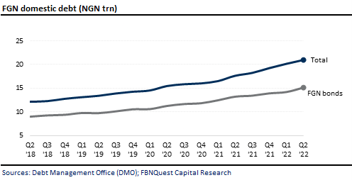 We continue our discussion on Nigeria’s debt profile. According to data published by the Debt Management Office (DMO) last week, the FGN’s domestic debt stock totalled NGN20.9trn (USD50.5bn), roughly equivalent to 12.1% of 2021 GDP. The FGN’s accumulation of domestic debt continues to rise unabatedly. In Q2’22, the FGN’s domestic debt increased by 19% y/y and accounted for c.80% of the nation’s domestic debt. The key driver has been the DMO’s record issuance of FGN bonds at monthly primary market auctions this year. The agency issued NGN1.6trn (ex. non-competitive bids) in FGN Bonds during H1 ’22. This compares with NGN1.1trn issued over the same period last year.