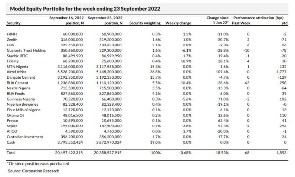 Last week the Model Equity Portfolio fell by 0.68% compared with fall in the NGX All-Share Index of 0.91%, outperforming it by 23ps. It has gained 18.53% year-to-date compared with a gain in the NGX-ASI of 14.77%, outperforming it by 376bps