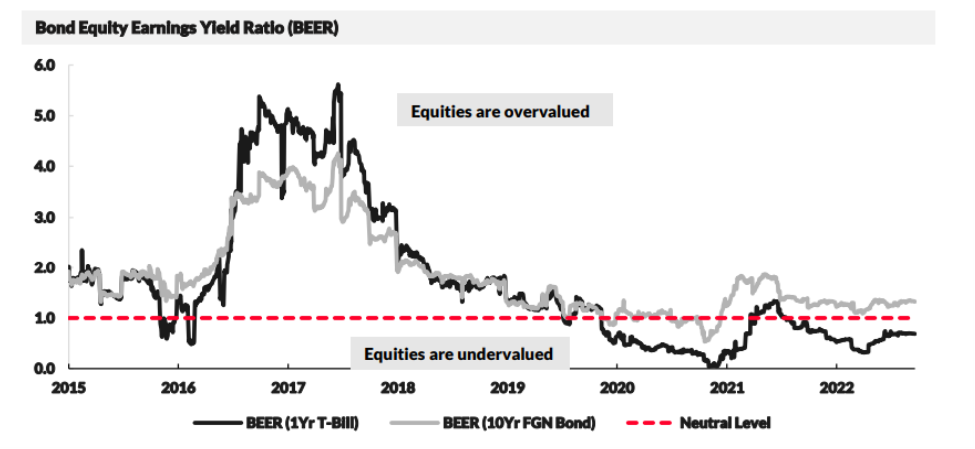 At 0.7x, the BEER for the NGX ASI to the 1-year T-bill is at similar levels seen during most of 2020 and in the second half of 2021 when market rates were falling.