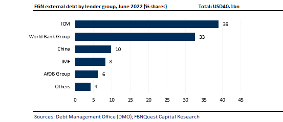 The Debt Management Office’s (DMO) quarterly release on public debt, shows that the FGN’s total external debt obligations increased by c.USD96m relative to the prior quarter to USD40.1bn in Q2 ’22. This is roughly equivalent to 9.6% of 2021 GDP. On a y/y basis, the rise is more pronounced at c.USD6.6bn (+19.7% y/y).