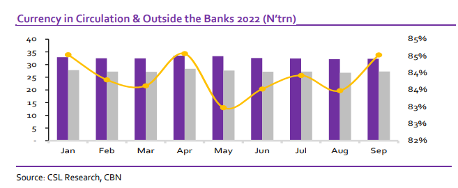 Meanwhile, Money Supply statistics from the CBN as of September 2022 showed that currency in circulation increased month-on-month by 0.56% to N3.23trn as of September 2022 from N3.21trn as of August 2022. Similarly, currency outside banks increased month[1]on-month by 1.85% to N2.73trn (representing 84.53% of currency in circulation) as of September 2022 from N2.68trn (representing 83.48% of Currency in Circulation) in August 2022. We note particularly that currency outside the banks has averaged c.84.42% of currency in circulation since the year 1960; the lowest being 72% in May 2008 and highest being 94.78% in March 1995.