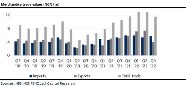 The net result was a trade surplus of NGN269.3bn, which represents an 86% decline compared with the NGN1.97trn surplus it recorded in the previous quarter. The trade surplus in Q3 ’22 is the third in a row.