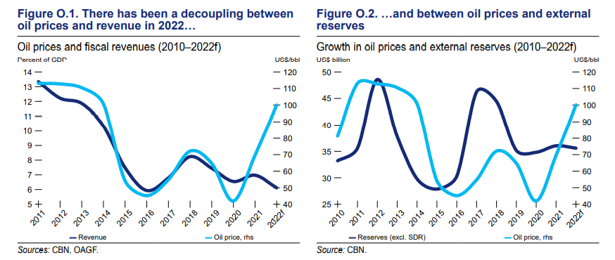 External and fiscal pressures have continued to grow, despite elevated global oil prices. Oil price booms have historically supported the Nigerian economy but this has not been the case in 2021–22. The average price of crude oil increased by over 150 percent from 2020 to 2022, yet Nigeria’s macroeconomic performance has weakened over this time, and its fiscal space has shrunk. In 2022, the general government fiscal deficit is estimated to have increased to 5.7 percent of GDP from 5.4 percent in 2020 before the boom. External reserves are little[1]changed since 2020, even after sizable eurobond issuances and International Monetary Fund (IMF) special drawing rights (SDR) allocation inflows. Foreign reserves fell from their recent high of US$41.8 billion in October 2021 (helped by the official sector inflows) to US$37.1 billion in November 2022. In fact, Nigeria’s recent economic performance has been more like that of an oil importing country facing headwinds from high global energy prices.