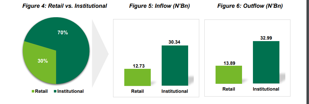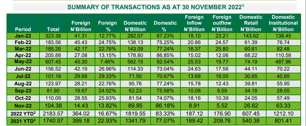Figure 4 below shows that Institutional Investors outperformed Retail Investors by 40%. A comparison of domestic transactions in the current and prior month (October 2022) revealed that retail transactions increased by 10.69% from N24.05billion in October to N26.62billion in November 2022. Similarly, the institutional composition of the domestic market increased by 10.16% from N57.49billion in October 2022 to N63.33billion in November 2022.