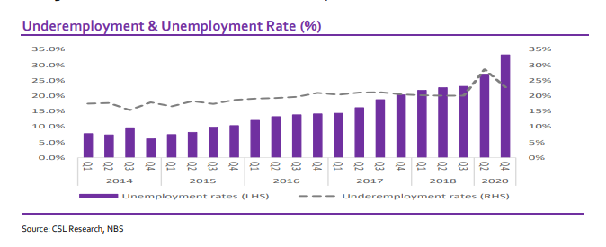 The high rate of unemployment could be attributed to several factors. Firstly, Nigeria has a large population with over 200 million people, making it the most populous country in Africa. Nigeria’s population growth has been almost at par with GDP growth, implying low productivity. Secondly, the novel COVID-19 presented its own challenges as Nigerian companies executed major salary cuts and layoffs of employees. Other factors that have contributed to the elevated unemployment numbers include the lack of quality education and training, corruption and red tape in the Nigerian government and the high cost of running businesses which makes it difficult for businesses to thrive. Lastly, the prevalent insecurity and FX crisis in Nigeria has made it difficult to attract foreign investments into the country.