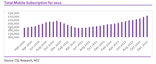 According to new data from the Nigerian Communications Commission, the total number of subscriptions grew from 195.13 million as of December 2021 to 222.23 million as of December 2022. This is despite the implementation of the Federal Government’s National Identification Number-Subscriber Identity Module policy. At the start of the policy in April 2021, over 72.77 million active telecommunication subscribers were barred from making calls. But the industry has since shaken off this effect, and this is evident by the 13.89% growth in subscriptions in 2022. An increase in broadband penetration has continued to lead to increased growth in the ICT sector which in turn continues to drive output in the overall economy.