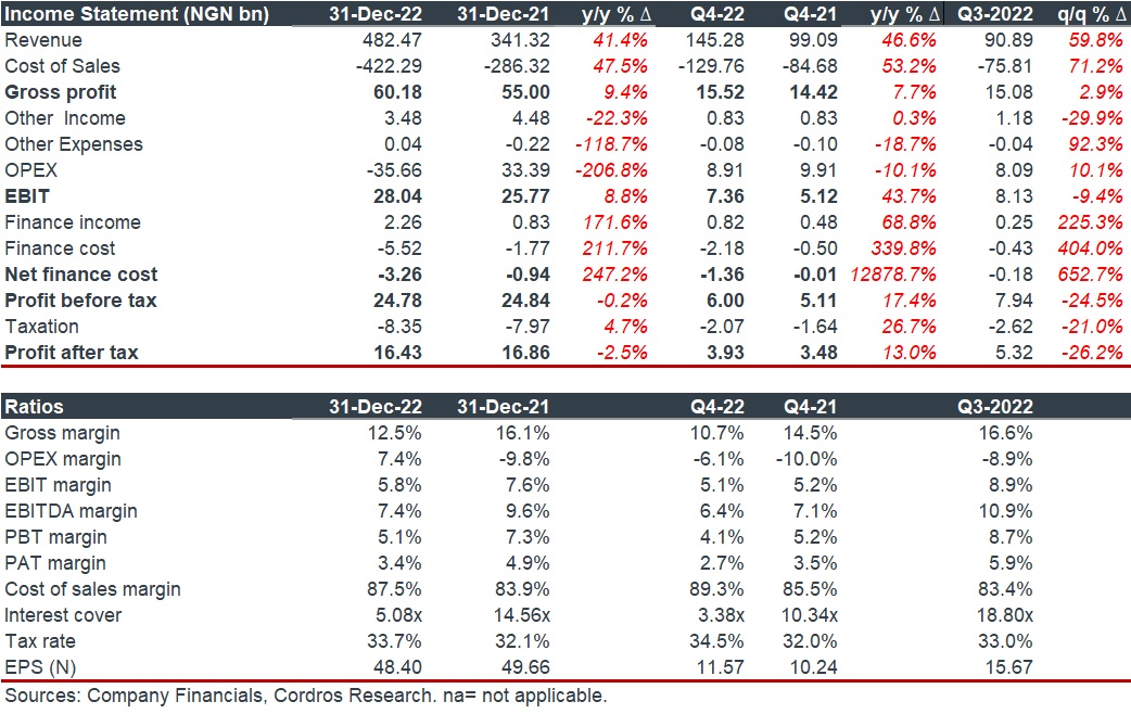 Net finance cost rose sharply to NGN1.36 billion in the quarter (Q4-21: NGN10.48 million), following a 339.8% y/y rise in finance cost. Notably, the higher finance cost outturn reflects the surge in interest on import loans (+3208.7% y/y) and on other loans (+67.8% y/y).