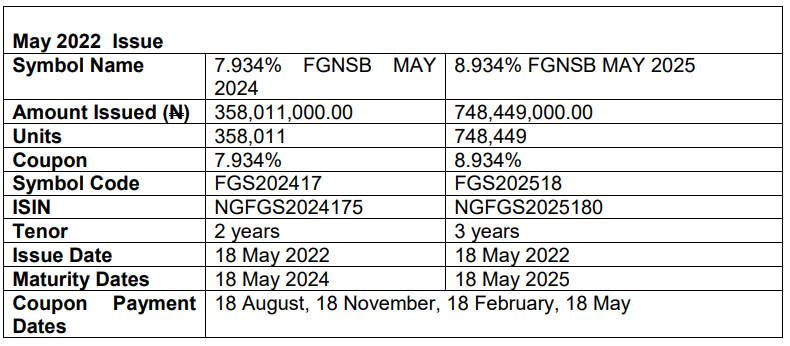 Investors BiteNGX Announces Listing of May 2022 FGN Savings Bonds Posted by InvestAdvocate on February 4, 2023 More in Investors Bite: NGXASI Advance +2.27% on Bellwether Gains April 28, 2026 NGX Climbs Sharply as Market Momentum Strengthens April 28, 2026 NGXASI Dips -0.94%, Buoyed by Banking Counters April 27, 2026Image Credit: fundsupgrade.comFebruary 3, 2023/NGXThe May 2022 Issue of the Federal Government of Nigeria (FGN) Savings Bonds was listed on the Nigerian Exchange Limited (NGX) on Tuesday, 31 January 2023. Below are details of the Bonds:Share this:Click to share on Facebook (Opens in new window)Click to share on Twitter (Opens in new window)Click to email a link to a friend (Opens in new window)Click to print (Opens in new window)