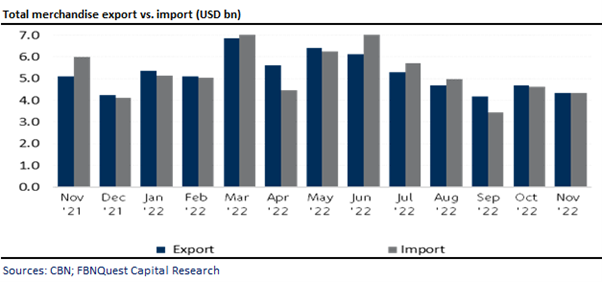 According to the CBN’s latest monthly economic report for Nov ’22, the provisional value of Nigeria’s total merchandise trade decreased by c.-7% m/m and around -22% y/y to USD8.7bn. The m/m decrease was driven by an -8% m/m and -6% m/m reduction in the value of merchandise export and import to USD4.3bn and USD4.4bn respectively. The decrease was even more pronounced on a y/y basis, with the value of total export and import falling by -15% and -28% y/y respectively. The trade position implies a trade deficit of -USD0.02bn for Nov ’22.