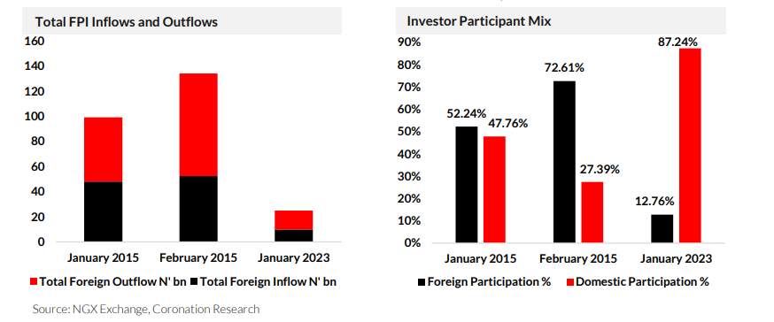 Since 2015, the number of foreign investors leaving the Nigerian stock market has been increasing due to several challenges, including the existence of multiple exchange rates that affect credible price discovery, and FX scarcity, which impedes repatriation of funds. As of January 2023, the total value of transactions in the nation’s stock market rose by 38.66% to N195.10bn (US$422.94m) from N140.70bn in December 2022. Although monthly FPI transactions increased by 63.71% m/m to N24.9bn, with FPI outflows (7.72%) still exceeding inflows (5.04%), the total value of transactions executed by domestic investors outperformed those executed by foreign investors by about 74%. As a result, the share of domestic investor participation rose to about 87%, while that of foreign investors dropped to about 13%.