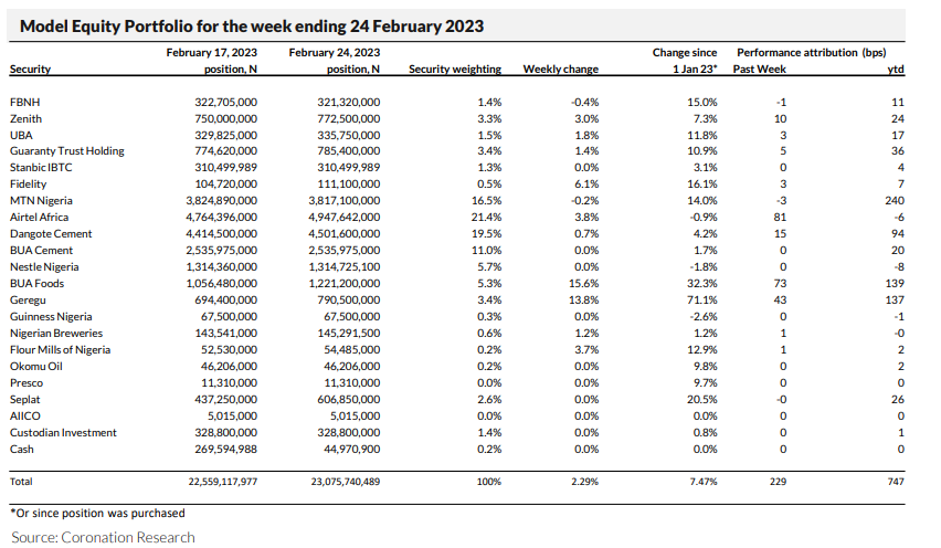 Last week, and as earlier advised, we planned to continue to build our overweight positions in Dangote Cement, ahead of a positive market response to its upcoming Q4 and full-year 2022 results which we expect this week. We have maintained the overweight position in Dangote Cement at four percentage points above its index-neutral weight, after some additional notional purchases. In addition, we planned to increase notional positions in Seplat in a bid to bring our exposure in it up to a neutral weight. We have increased the notional purchases in Seplat, and our exposure is now in line with the index. We expect some volatility in global oil prices over the coming month reflective of Russia’s supply cut from March 1. We will press on with these changes this week and review them next week.
