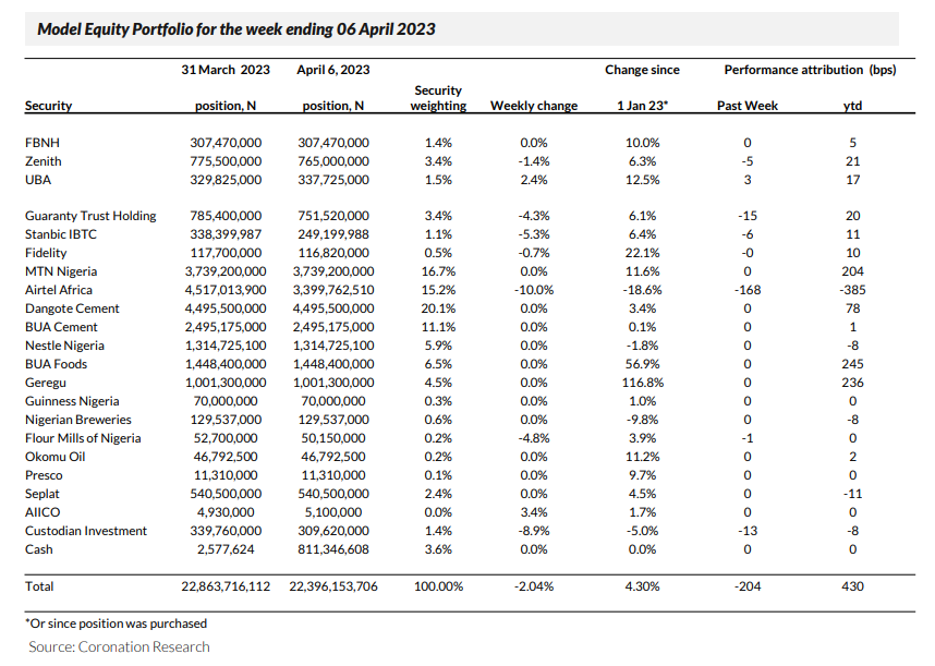 Last week the Model Equity Portfolio lost 2.04% compared with a fall in the NGX All-Share Index of 2.28%, outperforming it by 24bps. Year-to-date it has risen by 4.30% compared with a rise of 3.40% in the NGX All-Share Index, outperforming it by 90bps.