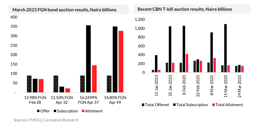 This means it has come close to meeting investor demand for bonds, with the result that bond yields have not moved much. By contrast, the CBN has been selling amounts of T-bills close to what it offers, with allotments not reflecting the huge sums that were being bid during January, February, and early March. The result was a crash in T-bill rates while FGN bond rates did not change much at this time. Now the sums being bid at T-bill auctions are much less than before (see the results for the 29 March auction in the chart, above) and T-bill rates have risen.