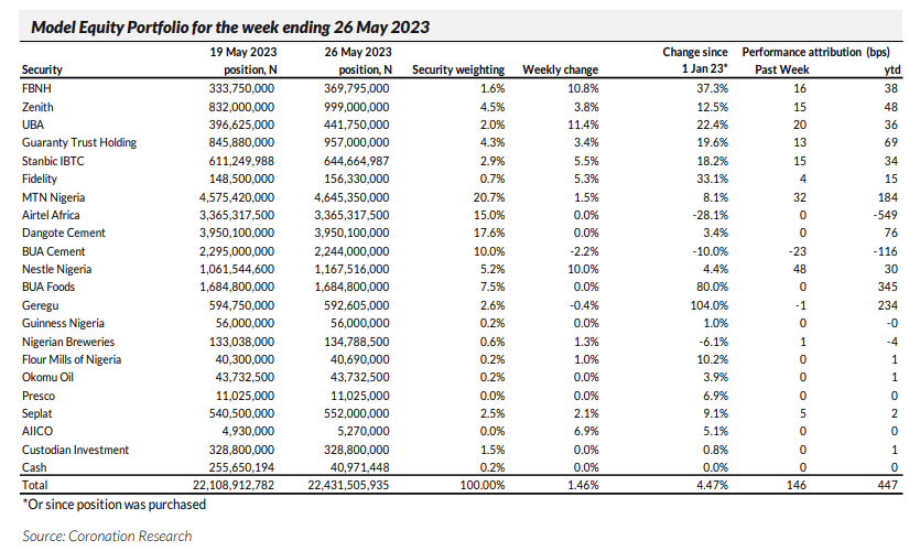 Last week the Model Equity Portfolio rose by 1.46% compared with a gain in the NGX All-Share Index of 1.51%, underperforming it by 5bps. Year-to-date it has risen by 4.47% compared with a rise of 3.36%% in the NGX All-Share Index, outperforming it by 111bps.