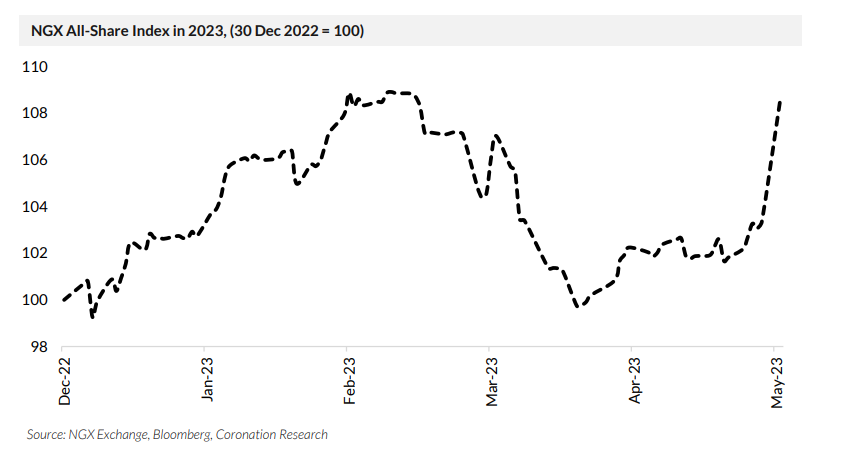 President Bola Ahmed Tinubu’s inaugural address was given yesterday, and it sparked the equity market’s imagination, with a rally of 5.23% today. The announcement of key market reforms, including phasing out fuel subsidies and unifying foreign exchange rates, shows that pro-market policies were not just items in the manifesto but issues which he is setting out to fix. If they are fixed, we expect much more from the equity market.