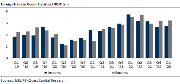 According to the most recent foreign trade in goods report produced by the National Bureau of Statistics (NBS), the total value of Nigeria’s merchandise trade dropped by 18% y/y to NGN12trn in Q1 ‘23. This figure comprises export and import trade balances of NGN6.5trn and NGN5.6trn respectively, which resulted in a net surplus of NGN927bn. The decline in the merchandise trade value can be attributed to decreases in both export and import trade; however, the import trade experienced a more significant decline of -26% y/y. Export trade also decreased by approximately -9% y/y.