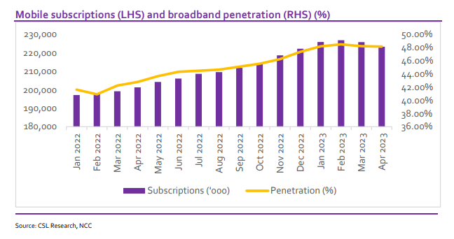 Based on new industry data from the Nigerian Communications Commission (NCC), Nigeria’s mobile subscriptions declined marginally by 1% to 223.3 million in April 2023 from 225.8 million in March, indicating a decrease of 2.5 million subscribers. This decline comes after mobile subscriptions reached an all-time high of 227.17 million in February 2023. Since then, we have witnessed two consecutive declines, a concerning trend for the nation’s mobile operators. Mobile subscriptions first fell to 225.82 million in March, before slumping further to 223.34 million in April. This is also the first time since June 2021 that mobile subscriptions have fallen consistently.